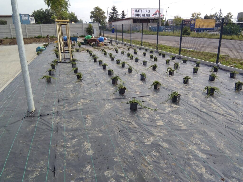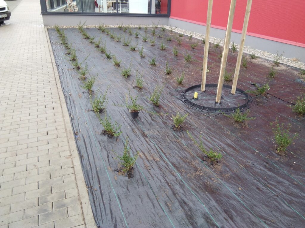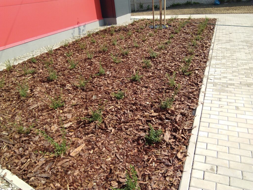 Nejdříve jsme vyrovnali terén a připravili půdu pro výsadbu. Podél cesty a parkovacích stání jsme vysadili keře, které dodávají místu živý rámec. Aby prostor působil udržovaně a přirozeně, přišla na řadu mulčovací kůra – nejenže zadržuje vláhu, ale také brání růstu plevele. A co by to bylo za vchod bez květin? Záhon přímo u dveří dotváří příjemnou atmosféru a zajišťuje, že si lidé obchod zapamatují už z dálky.